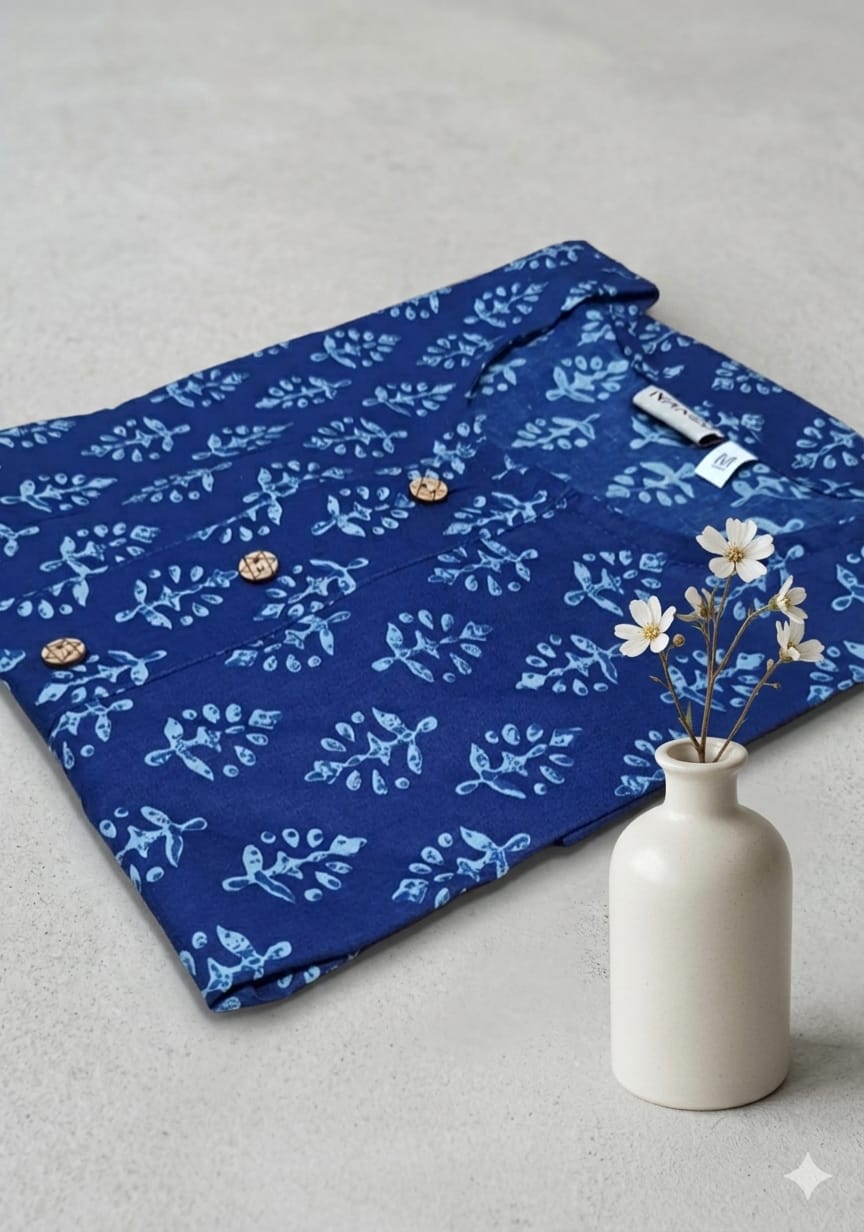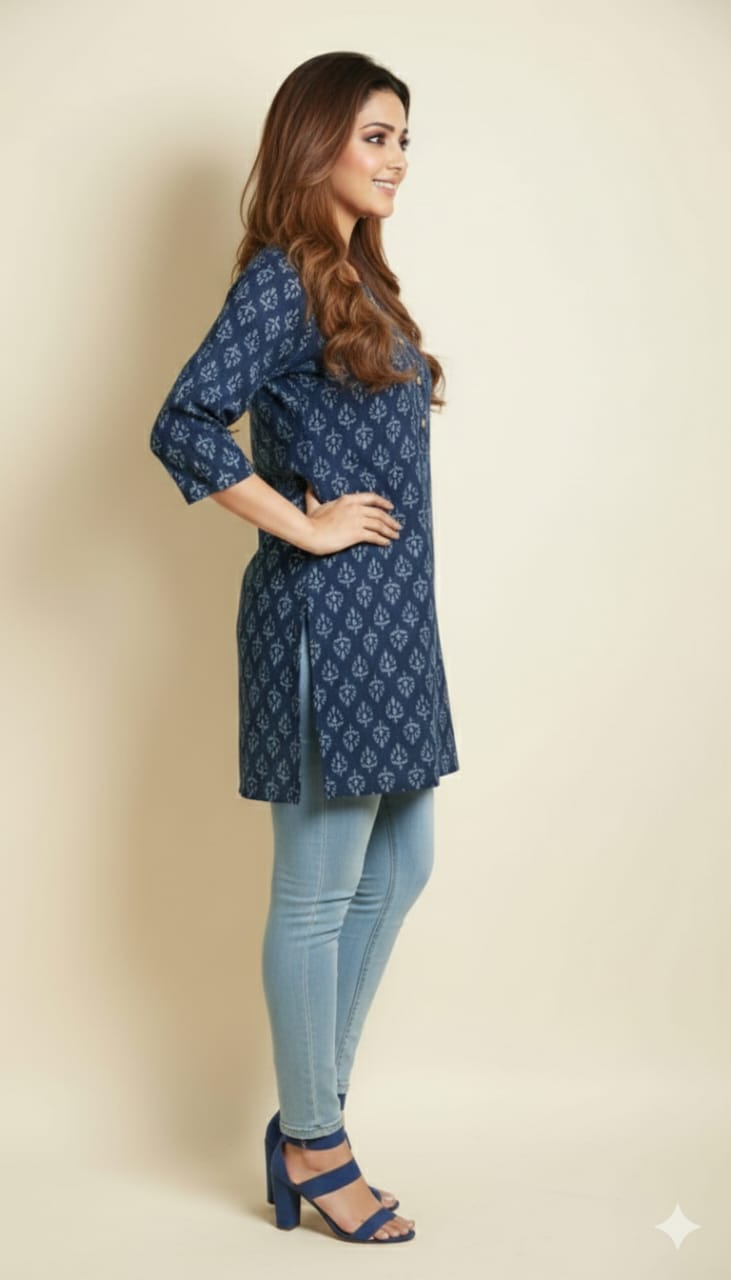 The tunic features a deep indigo blue base adorned with delicate, repeating printed motifs in subtle contrasting tones, creating a graceful and refined look. The straight-cut, shorter design ensures a flattering fit for all body types, while the button-detailed round neckline and three-quarter sleeves add versatility—ideal for both casual daytime wear and relaxed evening outings.