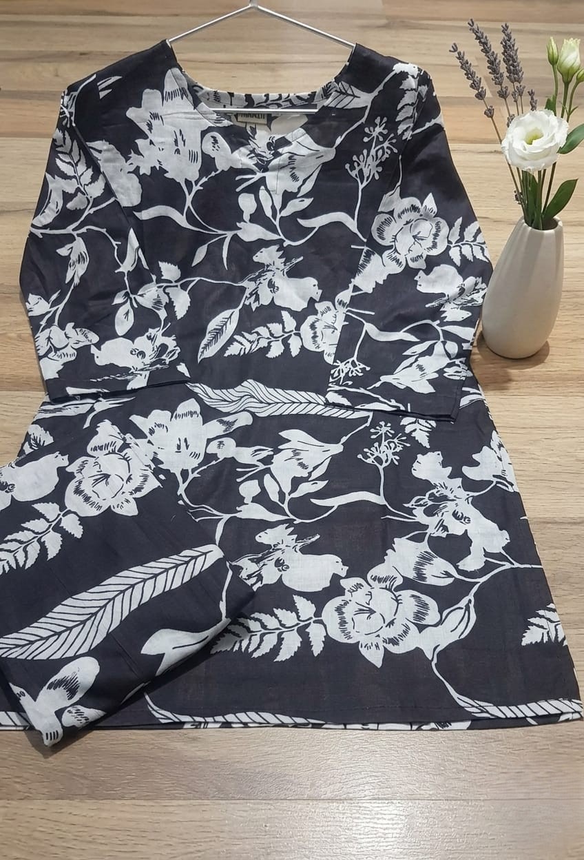 This is a women’s kurta–pant set, a popular ethnic outfit that blends traditional Indian style with modern comfort. The set includes a printed straight-cut short kurta paired with matching straight-fit pants, creating a clean and elegant silhouette. The kurta features a stylish notch neckline and three-quarter sleeves, making it suitable for everyday wear as well as semi-formal occasions. The bold, contrasting floral print gives the outfit a striking, cohesive look, while the breathable fabric ensures comfort throughout the day.