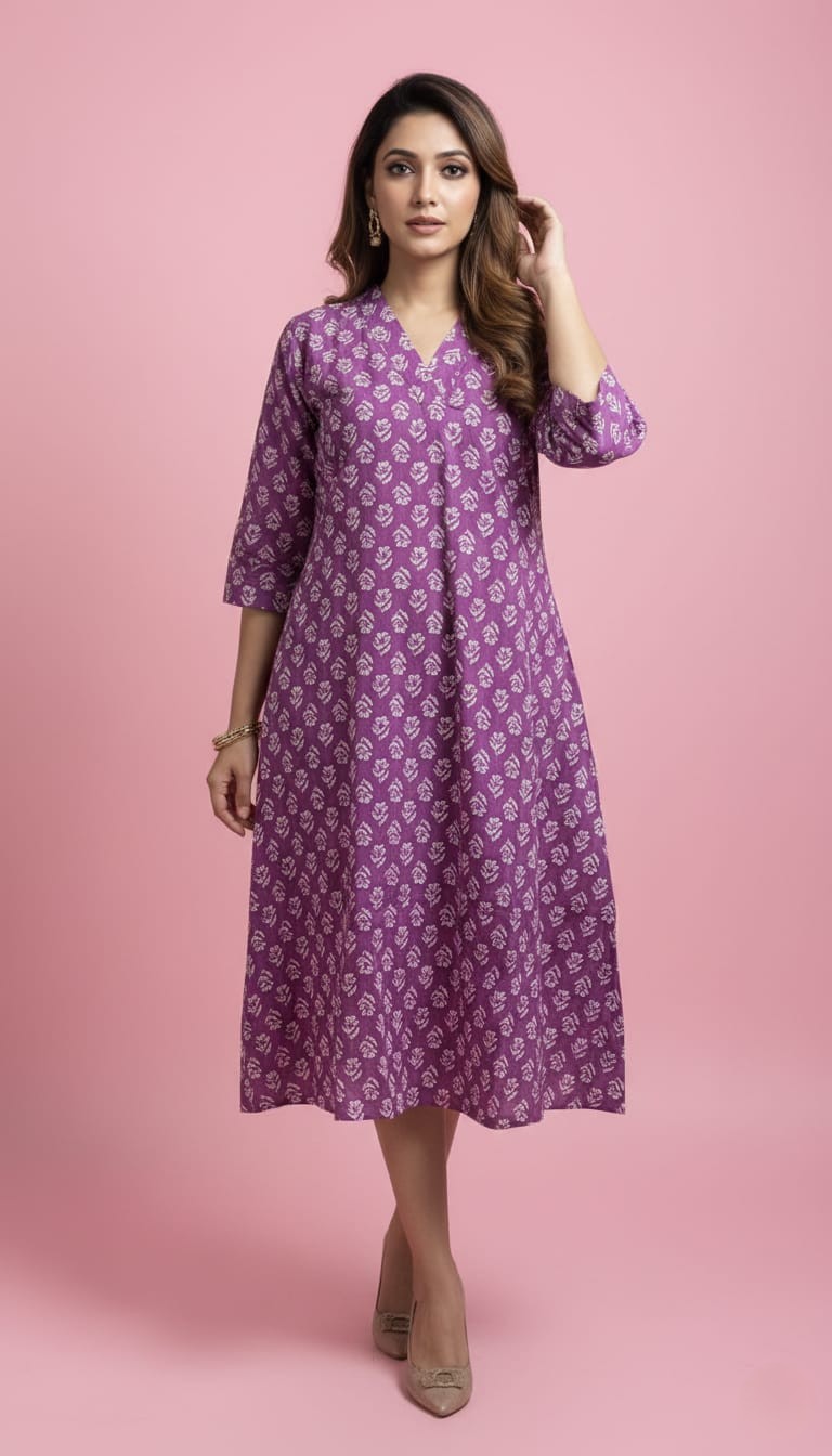 Crafted in a rich purple hue, the kurta is adorned with delicate all-over floral motifs that lend a soft, feminine charm. The A-line silhouette flows beautifully, offering a relaxed yet flattering fit that suits all body types. Its knee-to-calf length creates an elegant drape while ensuring ease of movement throughout the day.